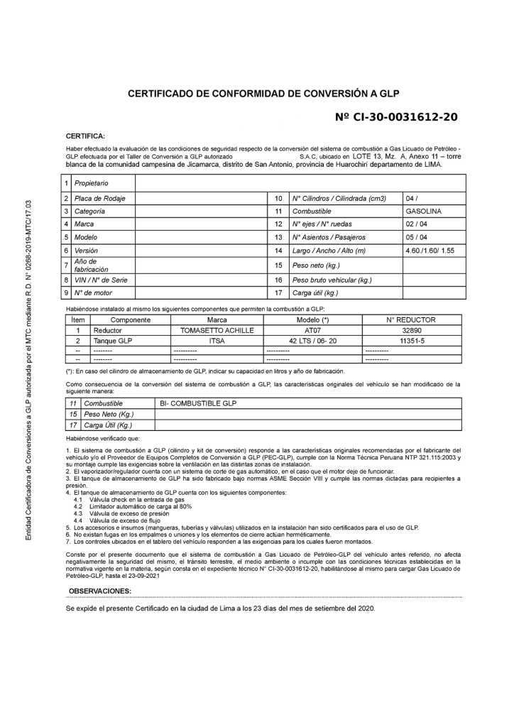La emisión del certificado es un procedimiento que el cliente debe cumplir obligatoriamente cada año. El propósito de este requerimiento es asegurar y evidenciar al estado peruano representado por el MTC, que los equipos de gas instalados en los vehículos se encuentren funcionando correctamente, cumpliendo con todas las normas de seguridad y bajo los planes de mantenimiento periódicos fijados por el fabricante del equipo.